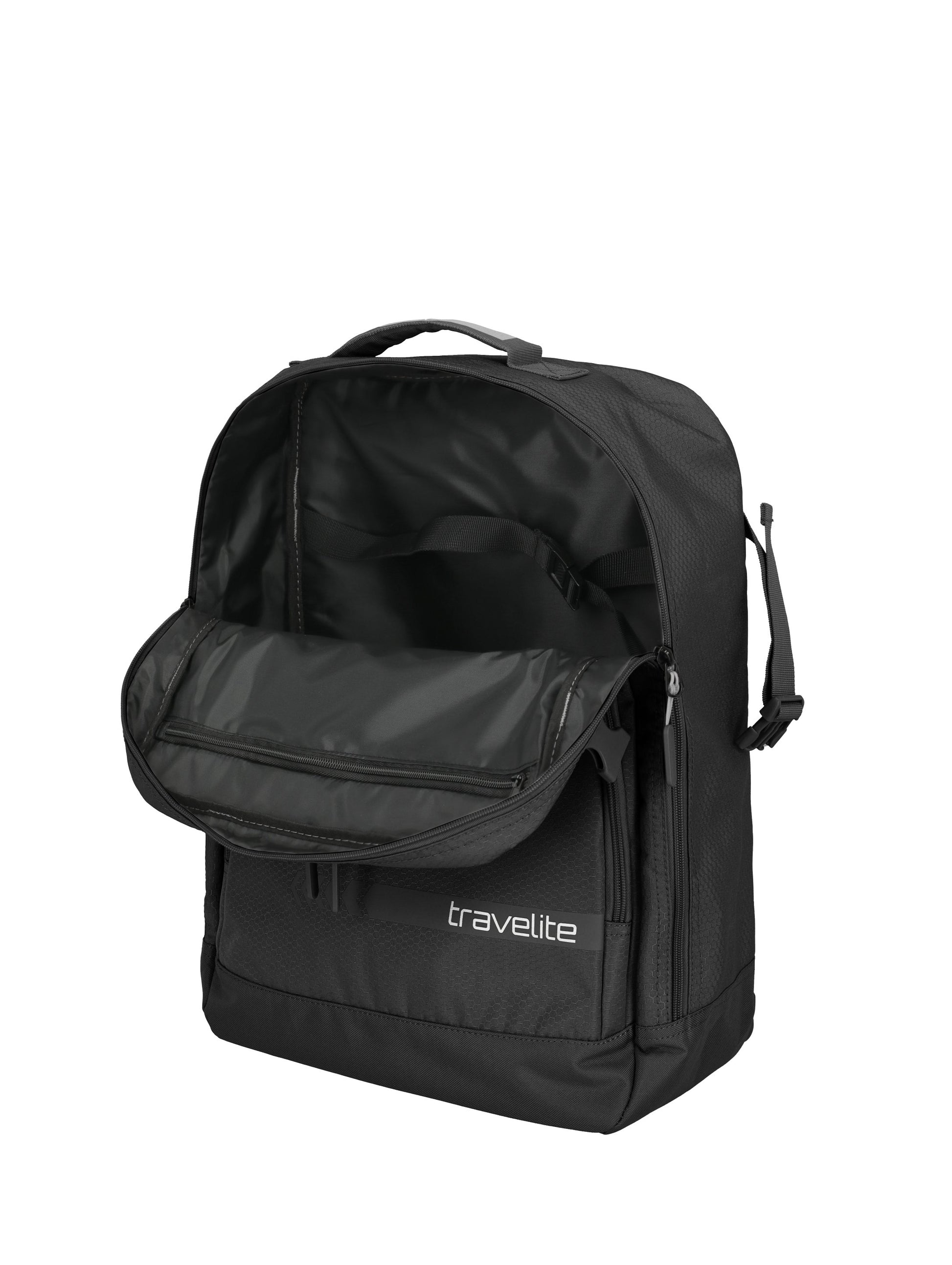 Smart carry-on luggage for every route: The Travelite KICK OFF backpack combines the flexibility of a travel bag with the comfort of a daypack. The durable polyester makes it lightweight, robust, and ready for travel, sports, and everyday use. Clever organization ensures order: a spacious front pocket, multiple zippered compartments, and interior packing straps reliably secure clothing, gadgets, and travel essentials. Padded, adjustable shoulder straps guarantee comfortable carrying; if necessary, they can be stowed away, allowing you to use the backpack as a bag in a snap. Thanks to its compact dimensions, it's ideal as carry-on/cabin luggage on many airlines and perfectly complements your suitcase or trolley. A sturdy carrying handle completes the functional design. Get the Travelite KICK OFF now and start your next trip lighter, more organized, and more relaxed!