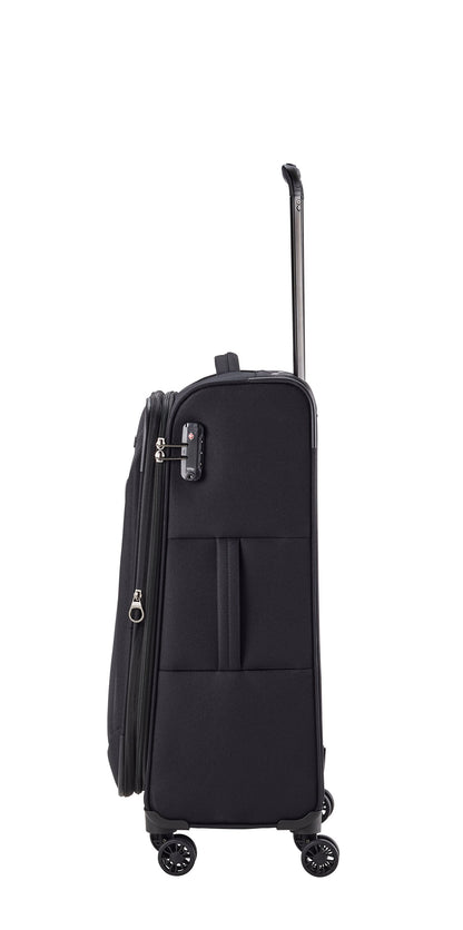 La valise à roulettes extensible Travelite CHIOS M est la valise de voyage idéale pour des voyages en toute sérénité. Légère, robuste et extrêmement flexible, elle passe de 60 à 66 litres grâce à son soufflet d'extension intégré, idéal pour vos bagages de retour. Son aménagement intérieur sophistiqué, avec ses sangles réglables, ses compartiments séparés et ses deux grandes poches avant, vous permet de garder tout à portée de main et parfaitement organisé. Ses quatre doubles roulettes et sa poignée télescopique verrouillable en alliage léger garantissent une manipulation aisée ; des protections de bord et une poignée de fond assurent une stabilité accrue. Une serrure à combinaison TSA est intégrée pour les voyages internationaux. Avec ses dimensions de 42 x 67 x 27-31 cm et son poids de seulement 2,9 kg, la CHIOS M est l'équilibre parfait entre bagage à main et grande valise. De plus, le modèle S (39 x 55 x 20 cm, 2,4 kg, 34 L) est disponible pour le bagage à main et le modèle L (46 x 78 x 30–34 cm, 3,4 kg, 90–97 L) offre un espace de rangement supplémentaire. Procurez-vous le CHIOS M dès maintenant et voyagez en toute confiance, sécurité et élégance lors de votre prochain voyage.