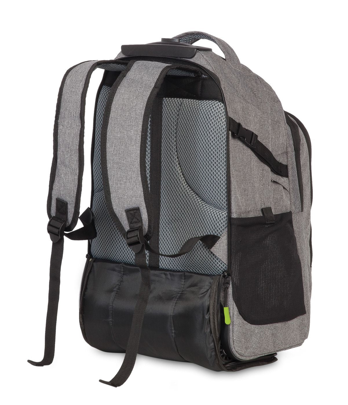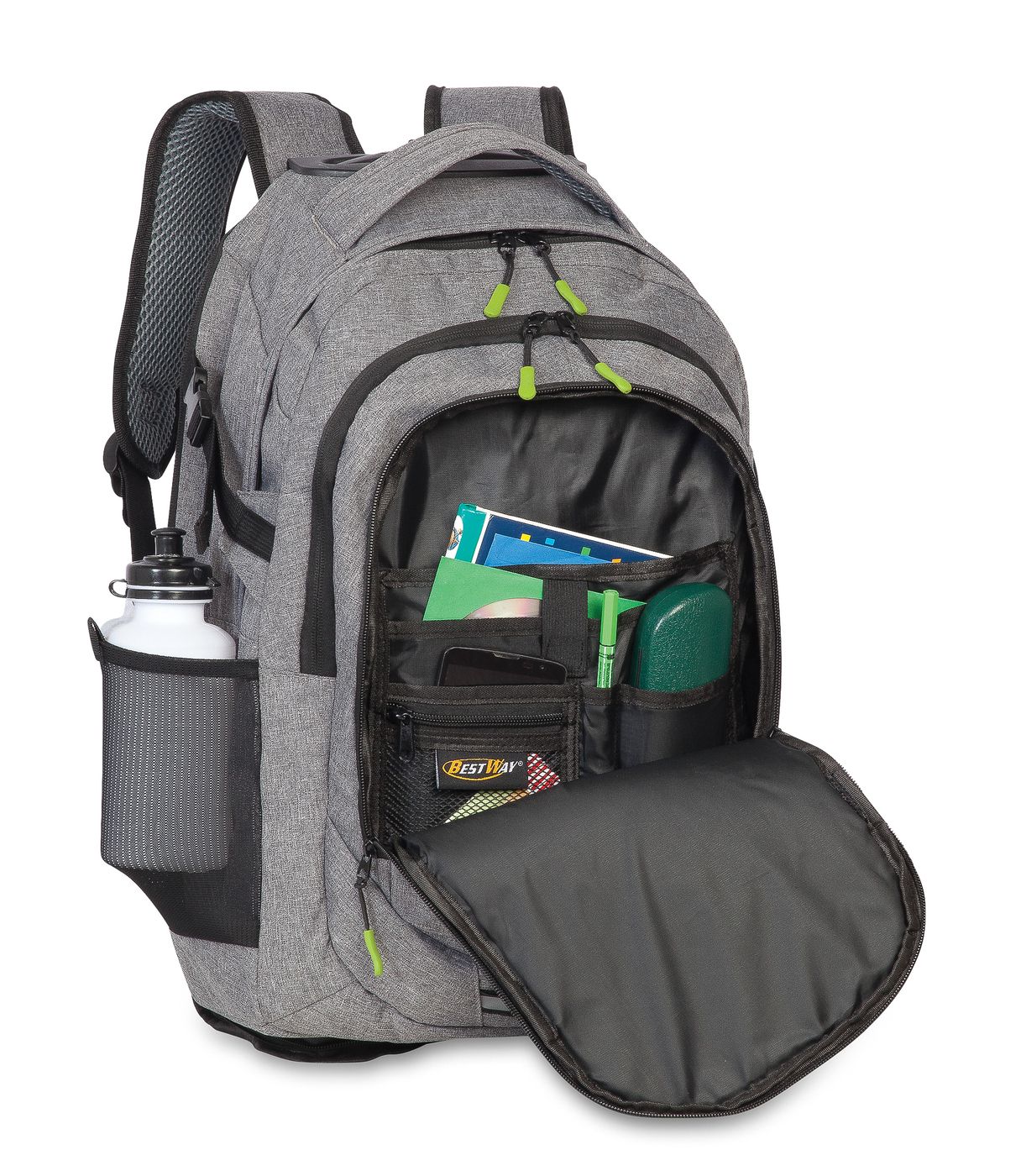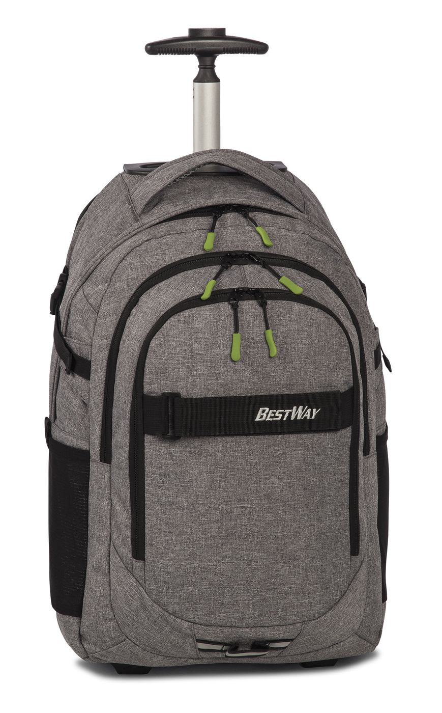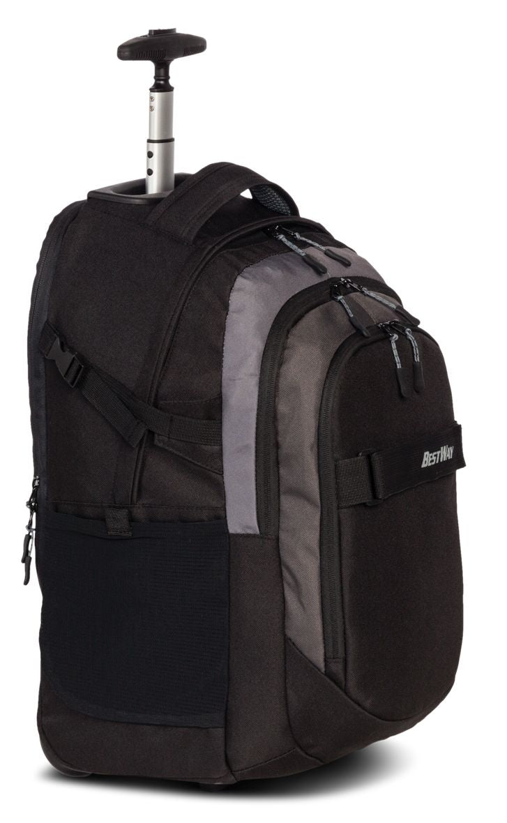 Der BestWay Evolution Roller Rucksacktrolley verfügt über ein großes Reißverschluss-Hauptfach, zwei RV-Vortaschen und zwei seitliche Netzfächer sowie zwei Reißverschluss-Vortaschen und einen praktischen Organizer. Er ist geeignet für breite DIN-A4-Ordner mit 8 cm Tiefe und bietet einen gepolsterten Tragegriff, gepolsterten Rücken sowie gepolsterte, verstellbare Schultergurte, die im Reißverschluss-Fach verstaut werden können. Seitliche Kompressionsriemen, zwei Leichtlaufrollen, zwei Abstellfüße und eine Skateboardhalterung mit Klettverschluss runden die Ausstattung ab.