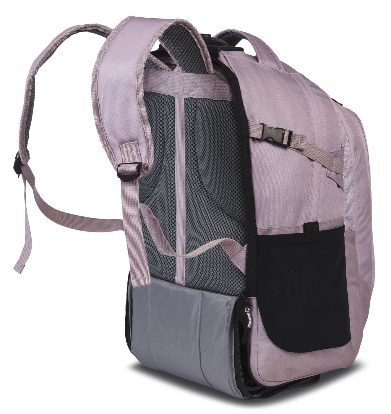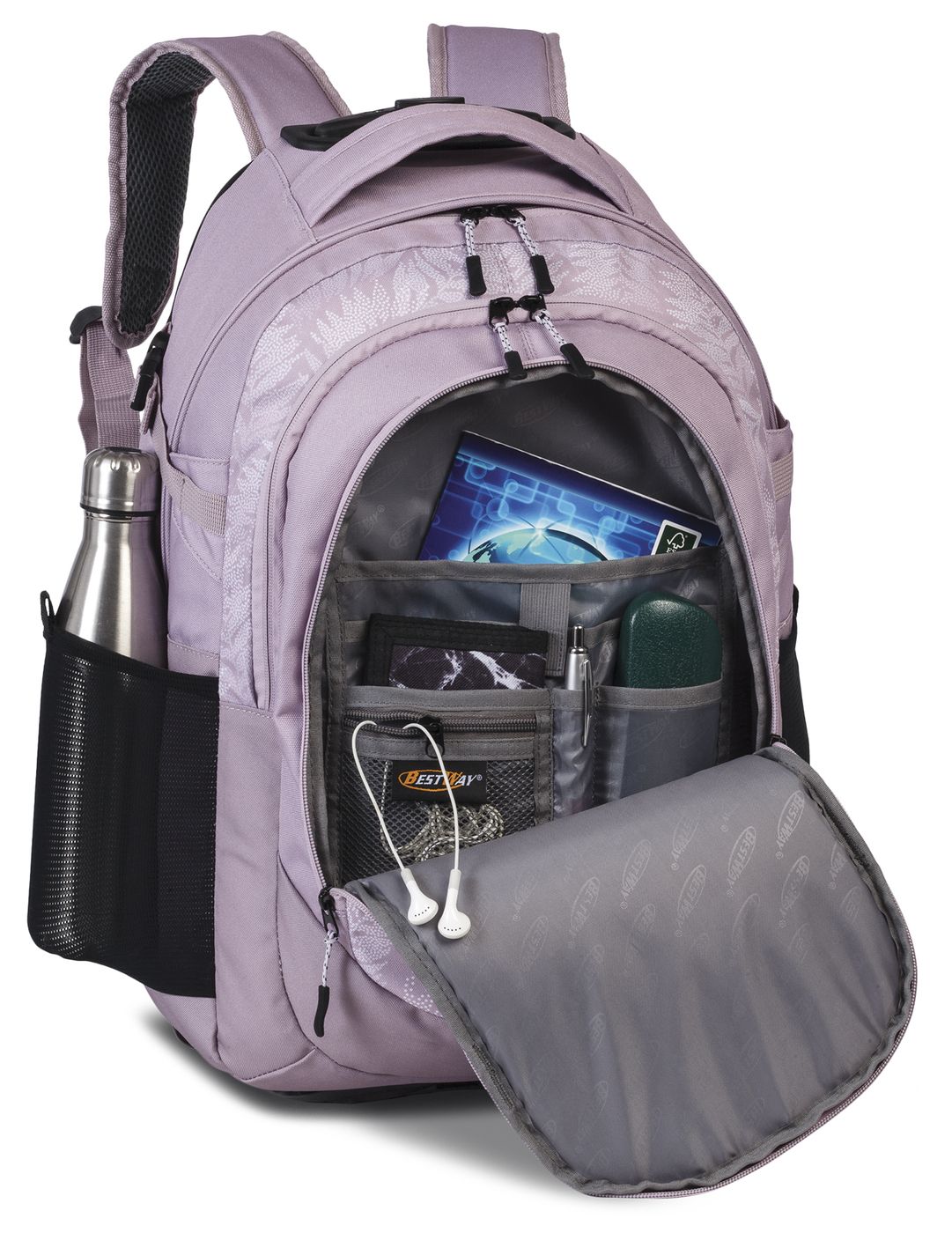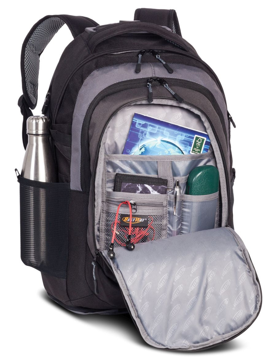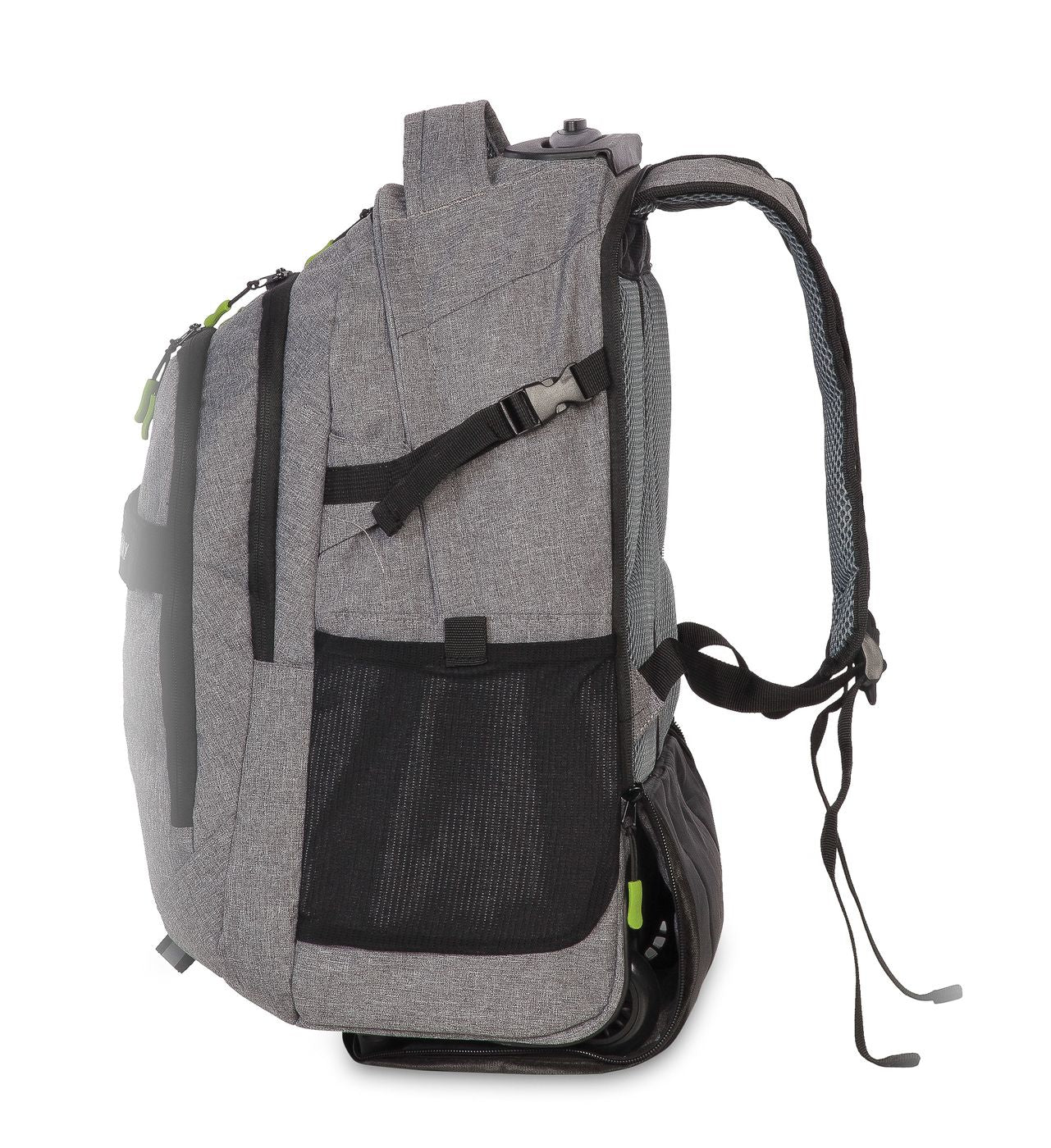 Der BestWay Evolution Roller Rucksacktrolley verfügt über ein großes Reißverschluss-Hauptfach, zwei RV-Vortaschen und zwei seitliche Netzfächer sowie zwei Reißverschluss-Vortaschen und einen praktischen Organizer. Er ist geeignet für breite DIN-A4-Ordner mit 8 cm Tiefe und bietet einen gepolsterten Tragegriff, gepolsterten Rücken sowie gepolsterte, verstellbare Schultergurte, die im Reißverschluss-Fach verstaut werden können. Seitliche Kompressionsriemen, zwei Leichtlaufrollen, zwei Abstellfüße und eine Skateboardhalterung mit Klettverschluss runden die Ausstattung ab.