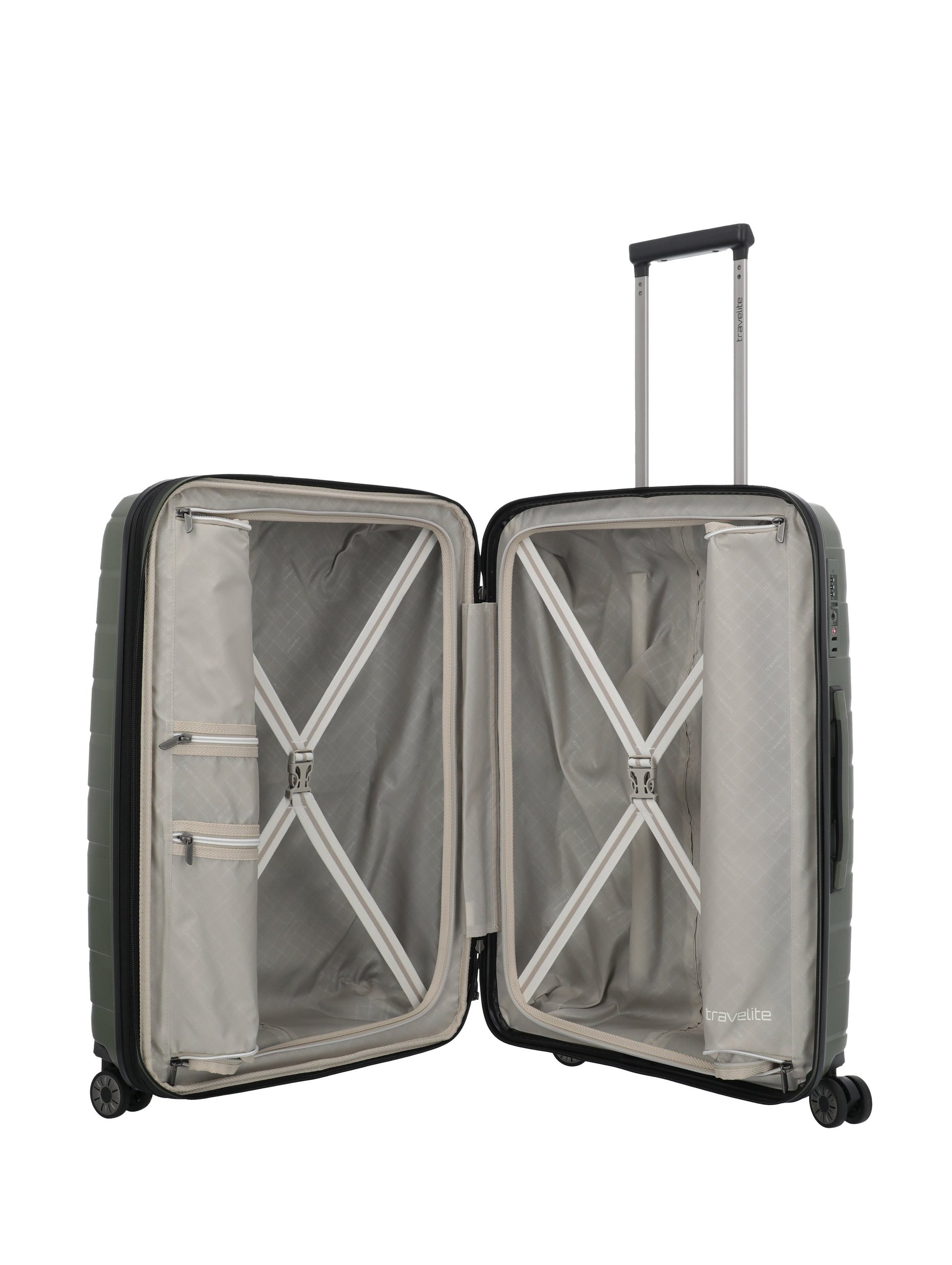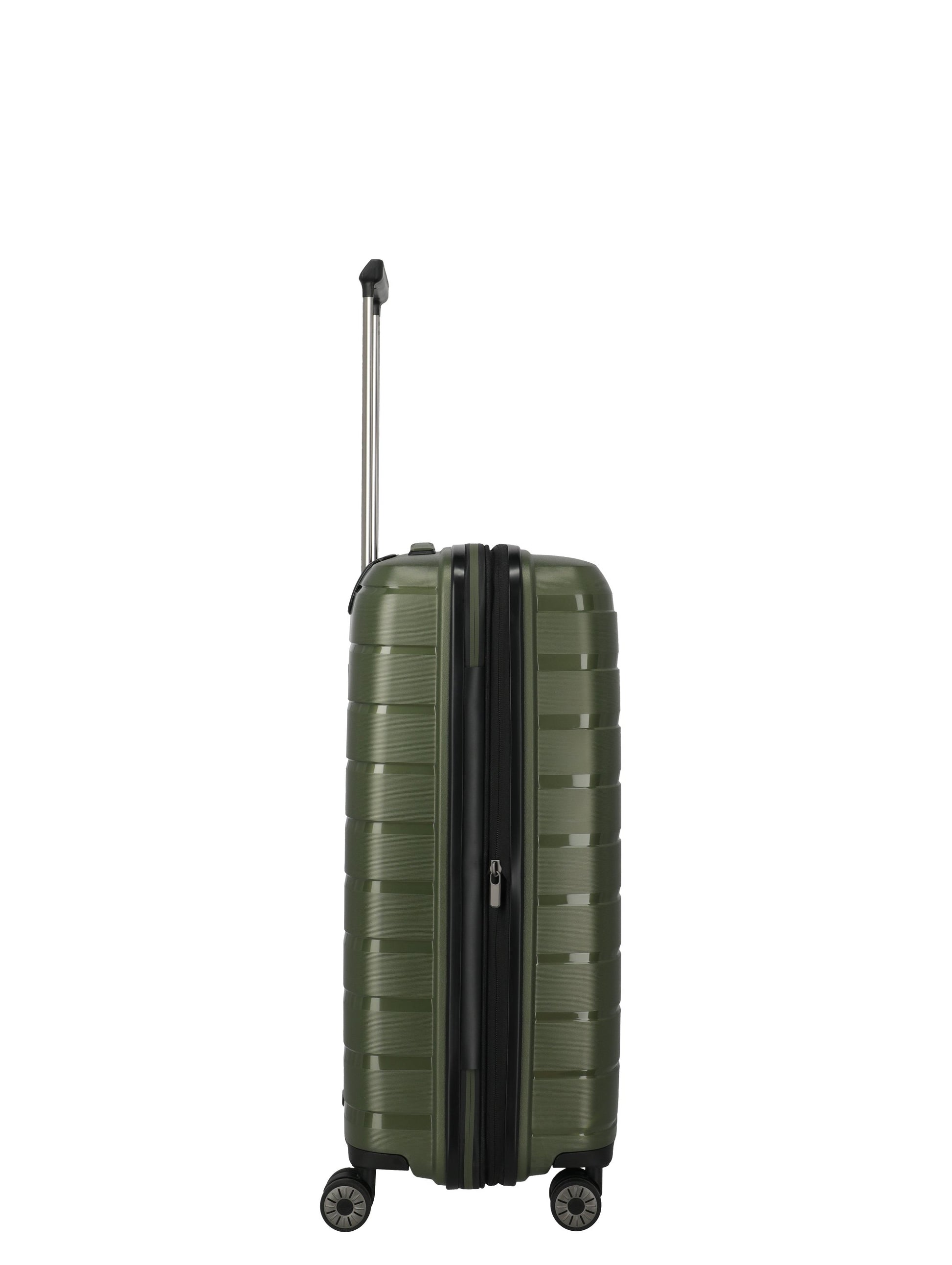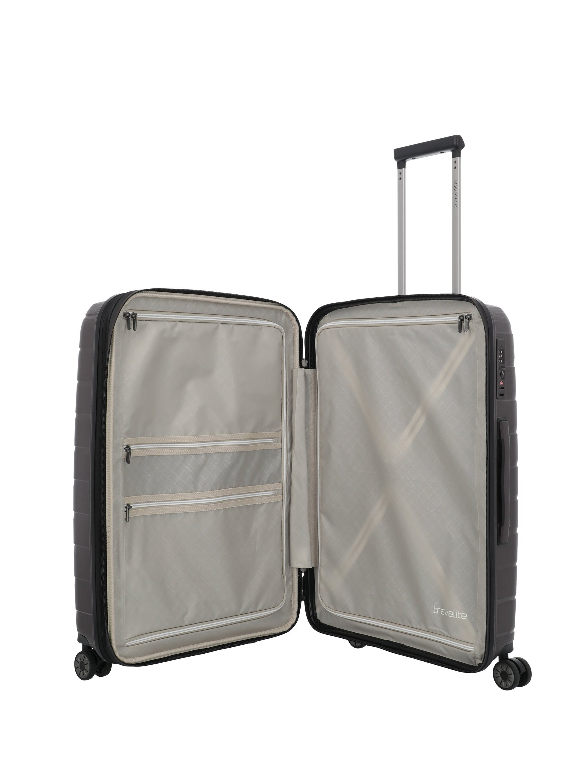 Der Travelite AIR BASE Trolley ist Ihr strapazierfähiger Begleiter für jede Reise – vom Städtetrip bis zur Business-Tour. Die Hartschale aus robustem Polypropylen schützt Ihr Gepäck zuverlässig und bleibt dabei angenehm leicht. Die markante, strukturierte Oberfläche mit matten und glänzenden Akzenten sorgt für einen modernen Look auf jedem Gepäckband. Mehr Flexibilität unterwegs bietet die integrierte Erweiterungsfunktion: Bei Bedarf vergrößern Sie das Packvolumen im Handumdrehen. Ein versenktes TSA-Zahlenschloss sichert den Inhalt auf internationalen Reisen. Für maximalen Komfort sorgen vier wendige Doppelrollen und ein stabiles, arretierbares Teleskopgestänge. Innen überzeugt der Koffer mit hochwertigem Futter, elastischen Packgurten sowie beidseitigen Trennwänden mit zusätzlichen Reißverschlusstaschen für perfekte Ordnung. Ideal als Trolley fürs Handgepäck (je nach Größe/Fluglinie) oder als großzügiger Koffer für längere Reisen. Reisen ohne Kompromisse – jetzt den Travelite AIR BASE Trolley sichern und mit Leichtigkeit durchstarten!